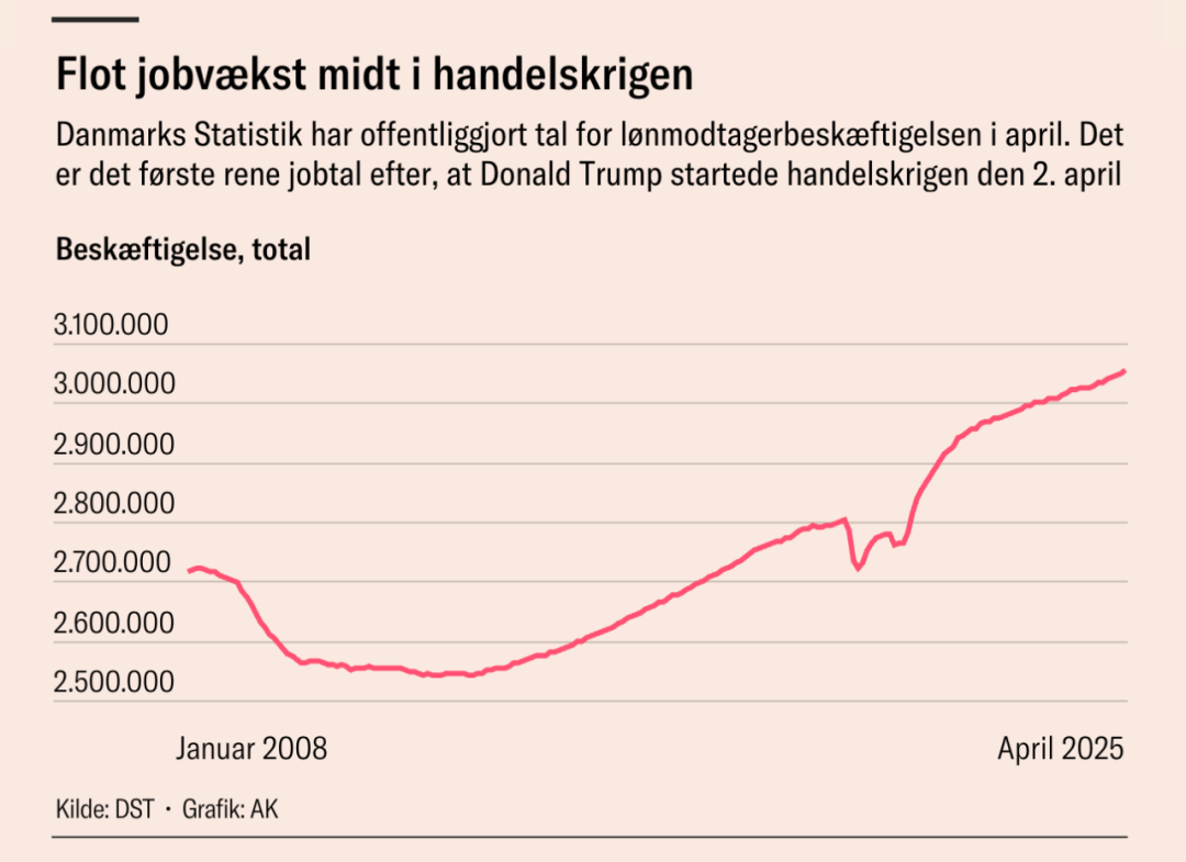2025年4月,丹麦劳动力市场迎来令人振奋的消息:工资就业人数激增5400人,创下近两年来最大单月增幅!据丹麦统计局(DST)最新数据,全国工资就业人数已达到305.57万人,连续20个月增长,并第47次刷新历史纪录。这一强劲表现不仅为个人带来了更高收入,也为国家财政注入了更多税收,为国防投资和公共福利提供了坚实支撑。